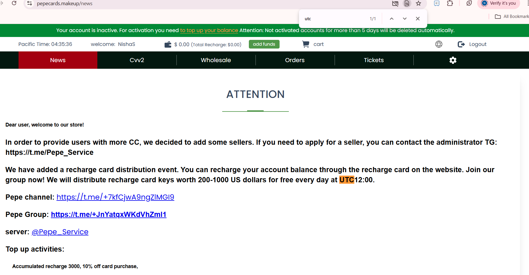 News: Daily posts for users, free recharge cards, new vendor applications, bulk drops. The important times are UTC 12:00 for giveaway tipping. Also warns of fake mirror sites and unofficial clones.